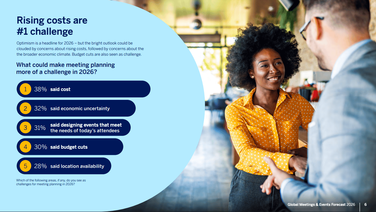 A few themes emerged from the session content, one of which is that costs are a significant concern. [Then again, when are they not? I can’t remember ever seeing headlines about ‘decreased costs’.] In Amex GBT’s 2026 Global Meetings & Events Forecast, released at IMEX, 68% of planners cited increased costs or budget cuts as their top challenge, with 71% expecting costs to increase next year.