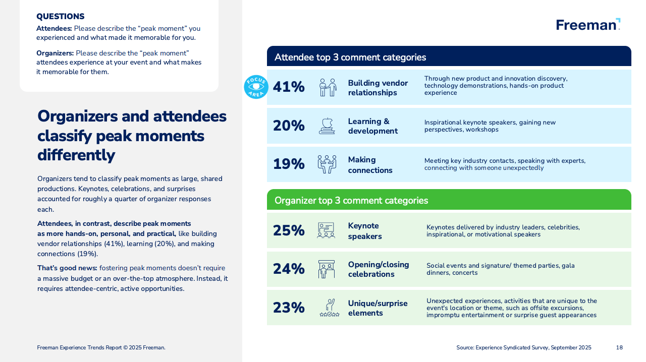 One thing that stuck out to me in is the perception gap between what organizers think are the most important aspects of their events and what attendees actually say it is. When asked whether attendees experienced a ‘peak moment’ at their event, 78% of organizers said yes, compared only 40% of attendees, nearly half as many.